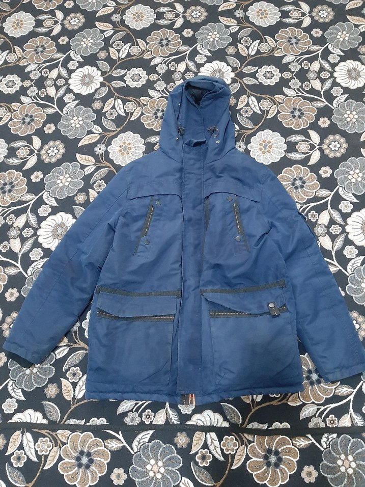 uzun kollu, bol kesim erkek mont. Koyu lacivert renkte, fermuarlı ceplere sahip, günlük sokak stili için uygun. Orta uzunlukta, yumuşak ve sıcak kumaştan yapılmış. fransa dan gelmiş az kullanılmış