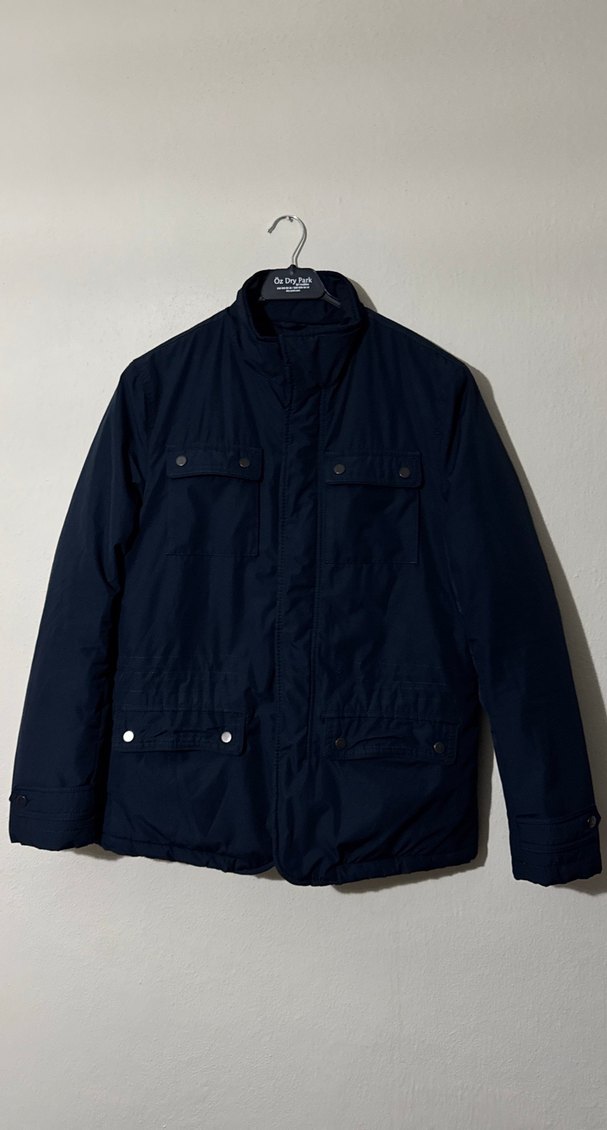 Lacivert erkek mont, uzun kollu ve normal kesim. Minimalist sokak stili ve dış mekan kullanımı için uygundur. Kusursuz defosuzdur. S Beden marka etiketi kesik