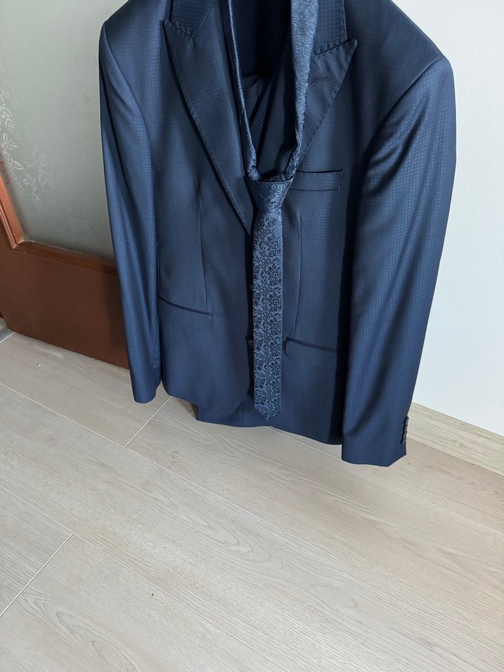 Lacivert, uzun boy, klasik yaka ve düğmeli erkek,yelekli ve kravat takım elbise. Ofis için uygun, regular fit ve uzun kolludur. Modern ve şık bir görünüm sunar.Sadece bir kez giyilmiştir.Ölçüleri resimlerde mevcuttur .