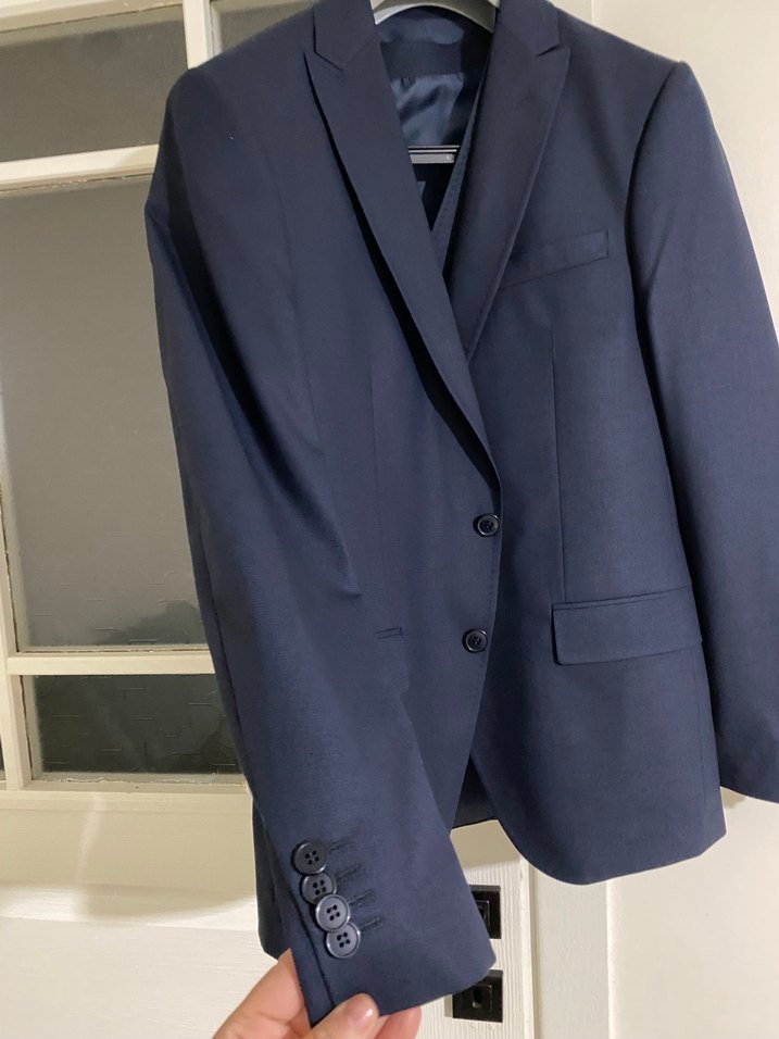 Lacivert renkli erkek takım elbise ceketi, çıtmalı yaka ve düğmeli uzun kollara sahiptir. Standart kesim ve klasik, desensiz tasarımı ile iş ortamına uygundur. Normal boyda ve düğmeli kapamalıdır.