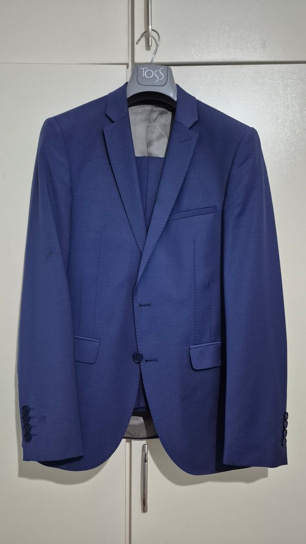 Lacivert, klasik kesim, düğmeli, uzun kollu erkek ofis takımı. İş ortamları için uygun, modern ve şık tasarım.