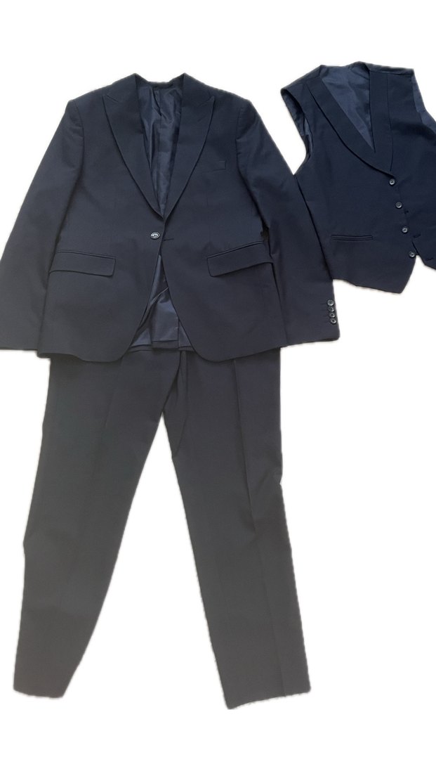 Siyah renkli, normal kesim erkek ofis takımı; düğmeli ceket, yelek ve uzun kollu pantolon içerir, klasik ve şık bir görünüm sunar. ️