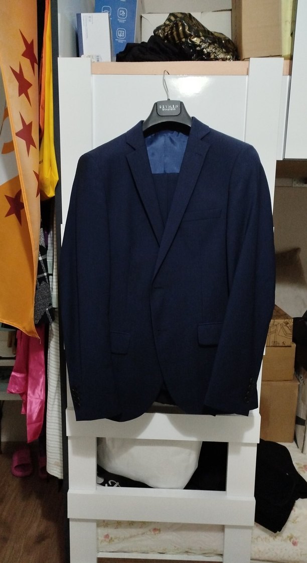 Lacivert renkte, regular fit kesime sahip erkek ofis takımı. Düğmeli, uzun kollu ve klasik yakalı, desen içermeyen şık tasarım.