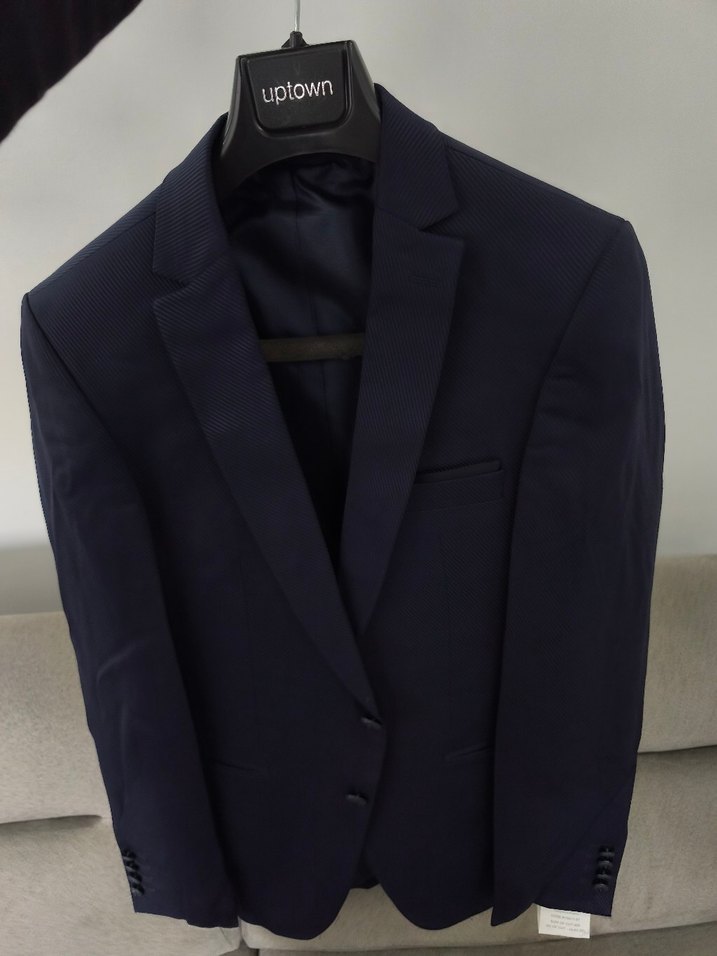 Lacivert, düğmeli, kesik yaka erkek takım elbise. Ofis ve iş ortamları için uygun, klasik ve sade tasarım. Uptown markalı.