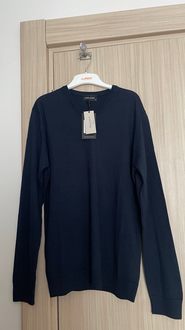 Lacivert renkli, pamuk kumaştan üretilmiş, uzun kollu ve yuvarlak yakalı erkek kazak. Normal boyda ve desen içermeyen sade tasarımıyla günlük kullanıma uygun.