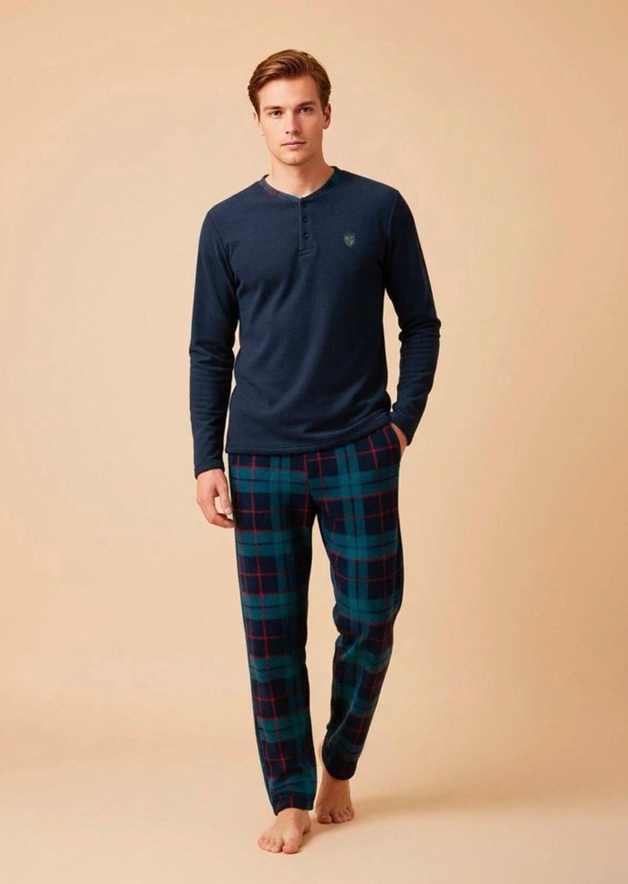 uzun kollu ve bisiklet yaka lacivert üst ile normal kesim ve midi boy ekose desenli pantolonlardan oluşan erkek pijama takımı.