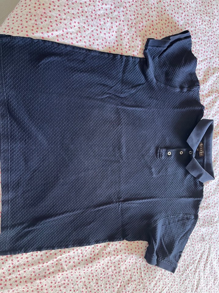 Lacivert renk, düğmeli yakalı, kısa kollu, sentetik kumaştan yapılmış erkek polo tişört. Sıkı kesim ve normal boyda, sokak stiline uygun.