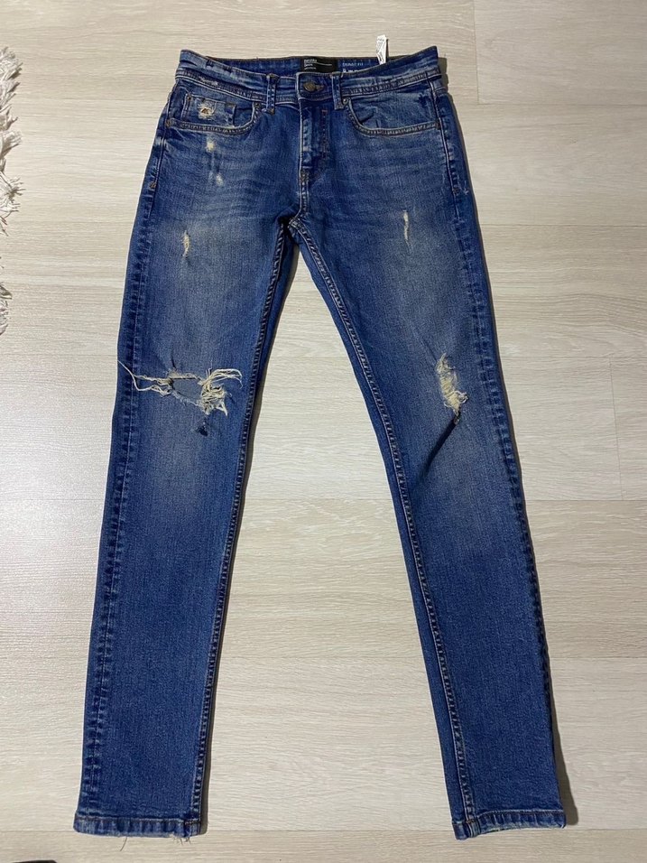 Lacivert erkek kot pantolon, regular fit ve normal boyda, dayanıklı denim kumaştan. Parlak görünümlü ve hafif yırtık detaylı, günlük sokak stiline uygun.