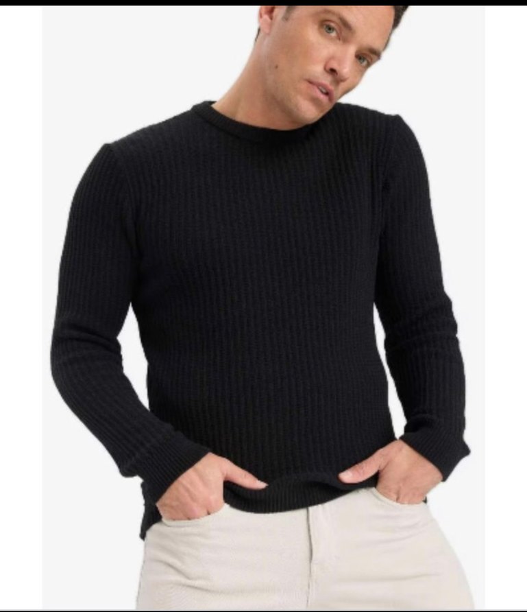 Siyah erkek kazak, yuvarlak yaka ve uzun kolludur. Yumuşak yün kumaştan örülmüş, düz desene sahip, günlük rahat kullanım için uygundur.
