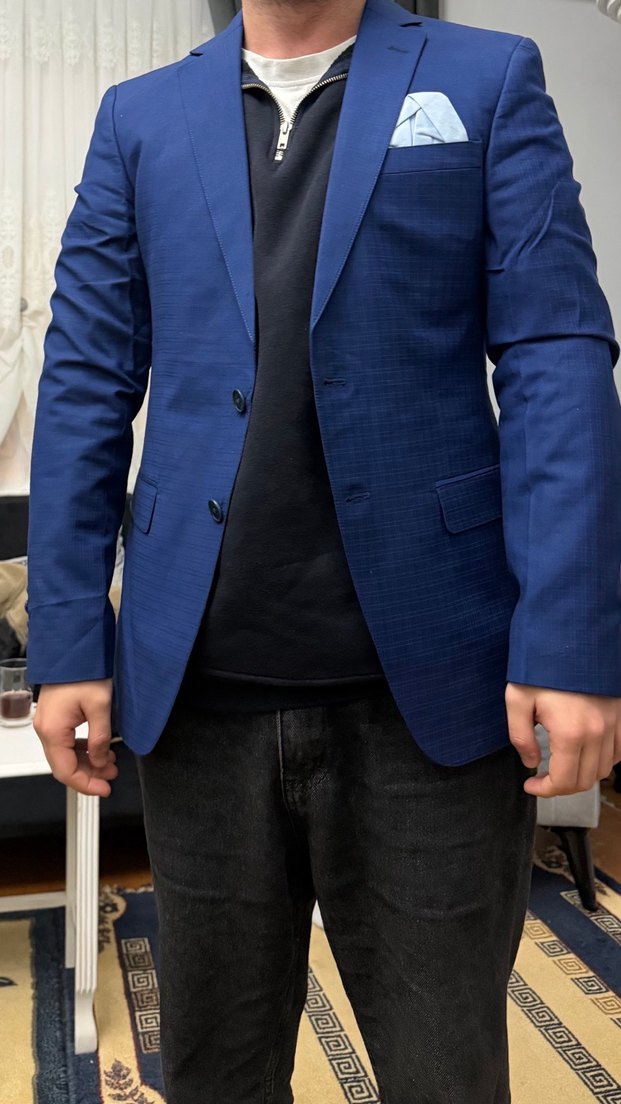 Lacivert renkli, düğmeli, normal kesim erkek takım elbise ceketi. İş ortamına uygun, uzun kollu ve yakası kesik modeldir.