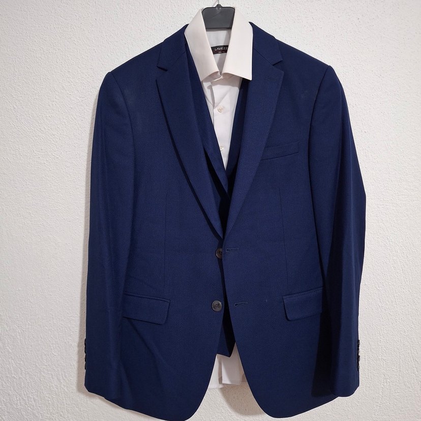 Lacivert erkek takım elbise, klasik kesim ve düğmeli tasarımla. Uzun kollu, normal boyda, ofis ve iş ortamları için uygundur. İki kez giyildi iyi durumda.