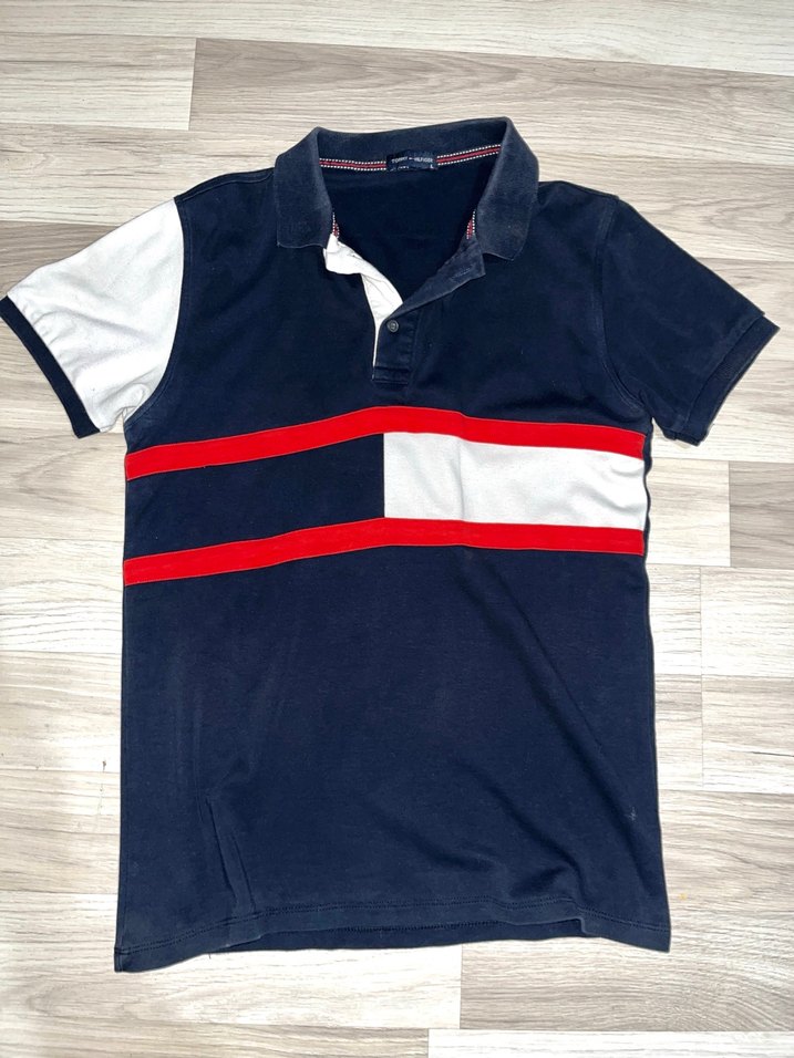 Kısa kollu, yaka ve düğmeli ön yüzü olan lacivert erkek polo tişört. Göğüste beyaz ve kırmızı yatay çizgiler bulunur. Orjinal tommy hilfiger, ölçüler: en 47 boy 67 cm