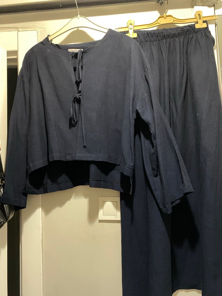 Lacivert renkte, uzun kollu ve yuvarlak yakalı geniş kesim erkek pijama takımı. Üstte bağcık detayı bulunan desensiz ve minimalist tasarım rahat kullanım sunar.