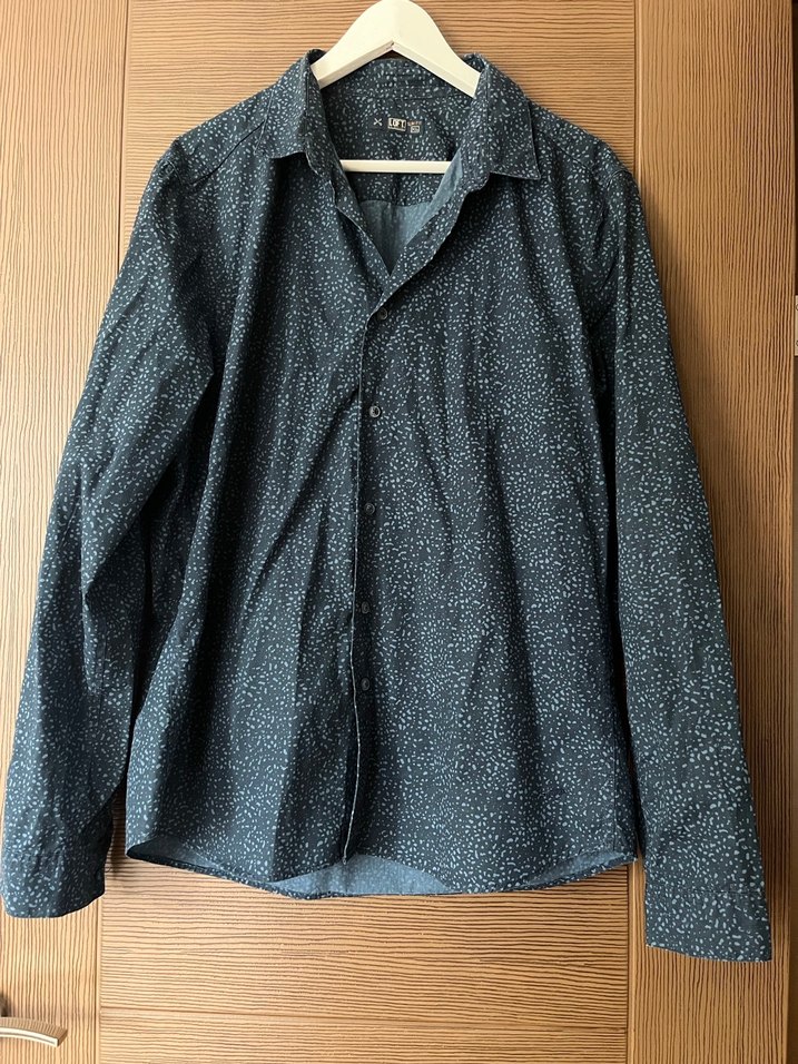 Lacivert erkek gömlek, uzun kollu ve yaka detaylıdır. Düğmeli ve bol kesim, günlük rahat sokak stili için uygundur.