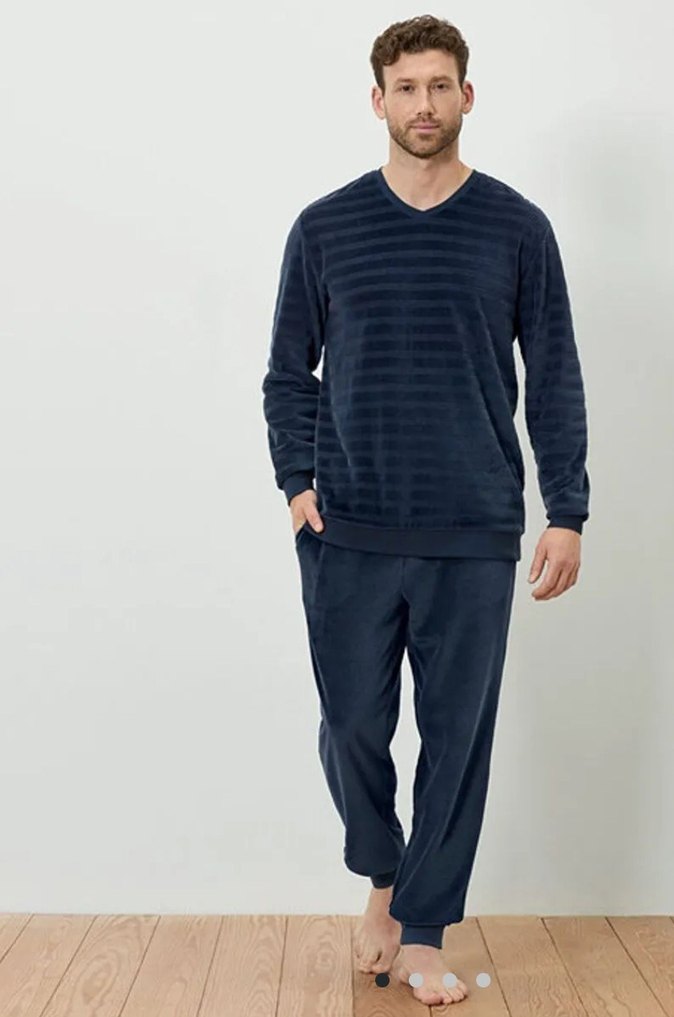 Lacivert renkte, V yakalı ve uzun kollu, bol kesim erkek pijama takımı, rahat ve şık bir görünüm sunar.