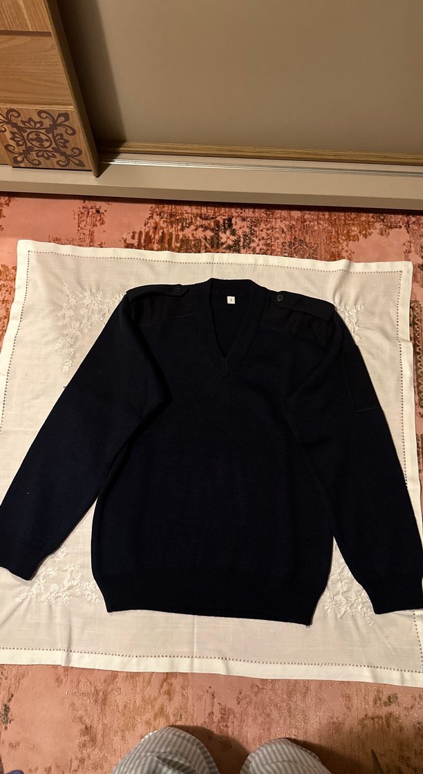Lacivert, v yaka, uzun kollu, bol kesim erkek kazak. Yumuşak ve sıcak kumaştan, günlük rahat kullanım ve sokak stili için uygundur. Dokuması şıktır. Sıcak tutar. Hiç giyilmedi.