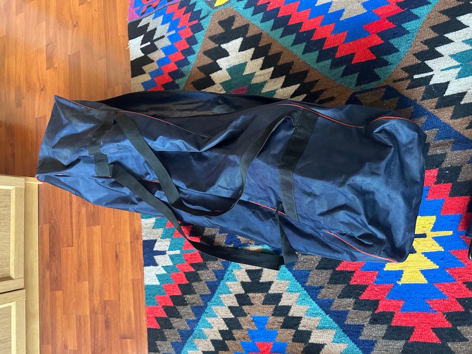 Eskrim amaçlı üretilmiş, lacivert ve fermuarlı çanta satılıktır. Resimde görüldüğü gibi tam takım bir set (elbise, elektrikli yelek, kablolar, maske, ayakkabı ve epe/flöre/kılıç rahatlıkla sığar.. Bir süre kenarda kaldığı için tozludur. Herhangi bir sorunu yoktur, fermuarları vs sağlamdır. İhtiyaç fazlası olduğu için satılıktır. İstanbul içine elden de teslim edebilirim.