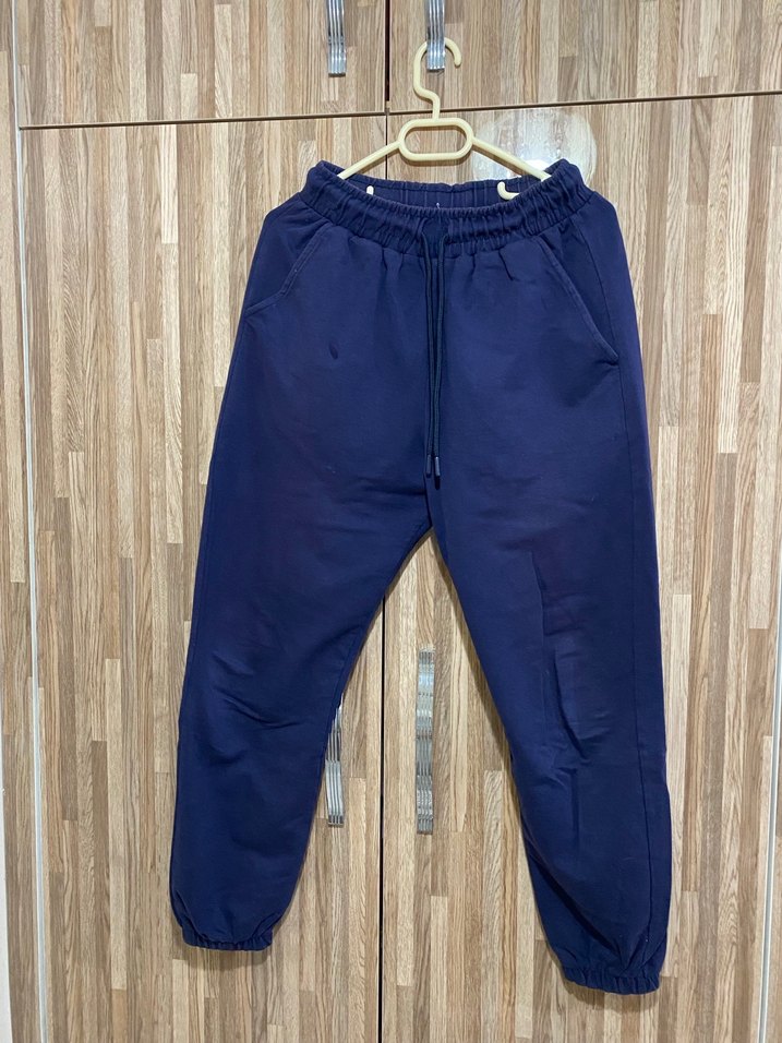 Lacivert, salaş kesim, elastik bel ve bilek detaylı, yumuşak sentetik kumaştan kadın eşofman altı. Spor ve rahat kombinler için uygun M ve S bedene olur