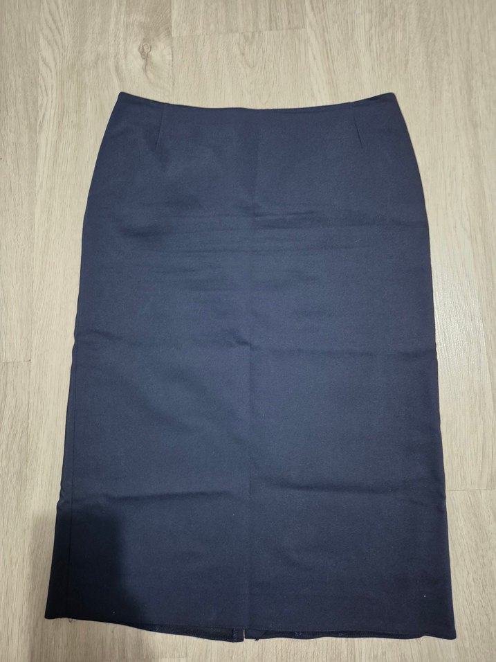 Lacivert midi kalem etek, düz ve rahat kesimiyle ofis şıklığı sunar. Ölçüleri görsellerde mevcuttur.