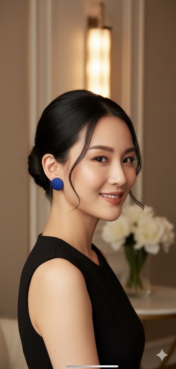 Lacivert renginde, etnik desenli midi uzunlukta minimalist küpeler, günlük kullanıma uygun zahmetsiz şıklık sunar.