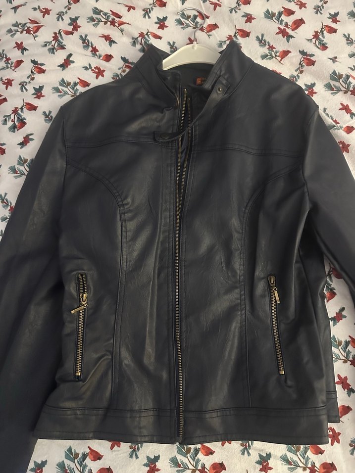 Fermuarlı cepleri ve keskin yakası olan lacivert slim fit deri biker ceket. Etiketinde 44 beden yazıyor ancak M–L bedene uygundur. Herhangi bir sorunu yoktur.