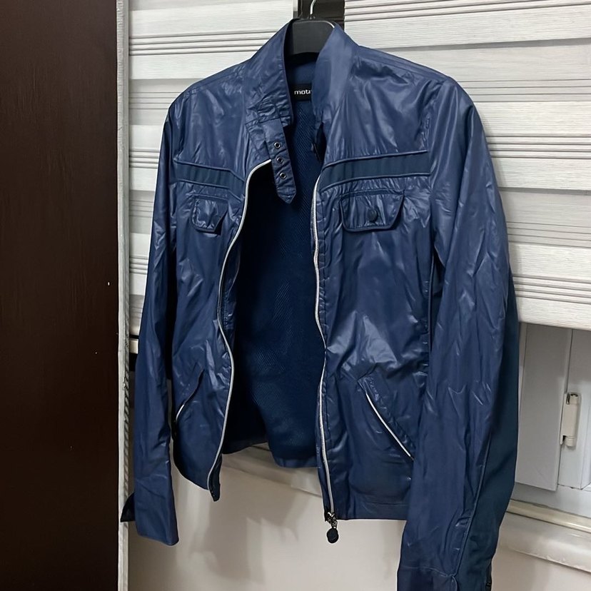 Lacivert renkli, sentetik kumaştan fermuarlı, yakalı ve uzun kollu erkek ceket. Dar kesim ve normal boyda, günlük ve sokak tarzına uygundur.