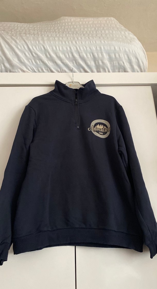 Lacivert fermuarlı, uzun kollu erkek sweatshirt. Yumuşak ve sıcak kumaştan, bol kesim ve göğüste baskılı 'Adventure' deseniyle günlük kullanım için uygundur.
