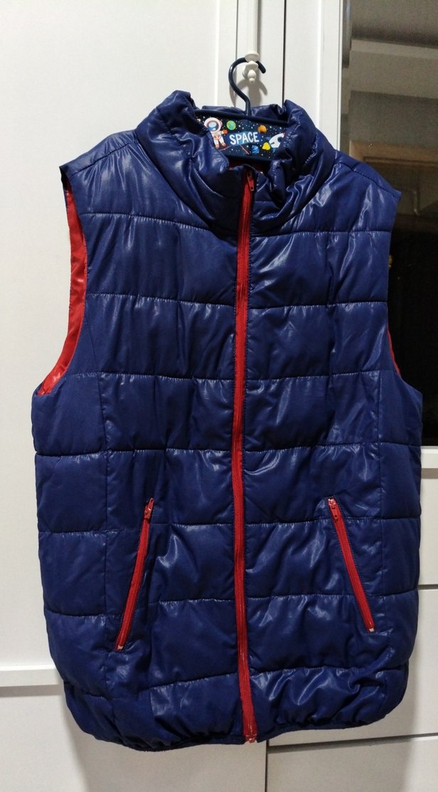 Lacivert renkte, fermuarlı ve yakalı kadın şişme yelektir. Kırmızı fermuar detaylı, kolsuz ve normal boyda, sentetik kumaştan üretilmiştir.
