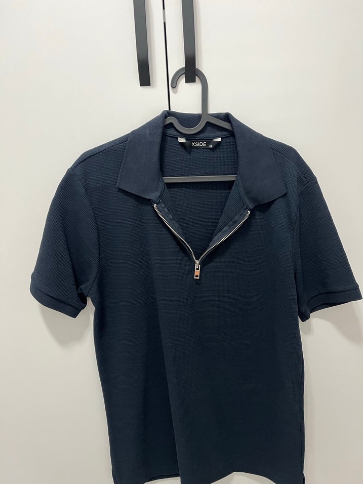 Lacivert renkte, fermuarlı yakaya ve kısa kollara sahip dar kesim erkek polo tişört. Sentetik kumaştan üretilmiş, günlük kullanıma uygun rahat bir sokak stili.