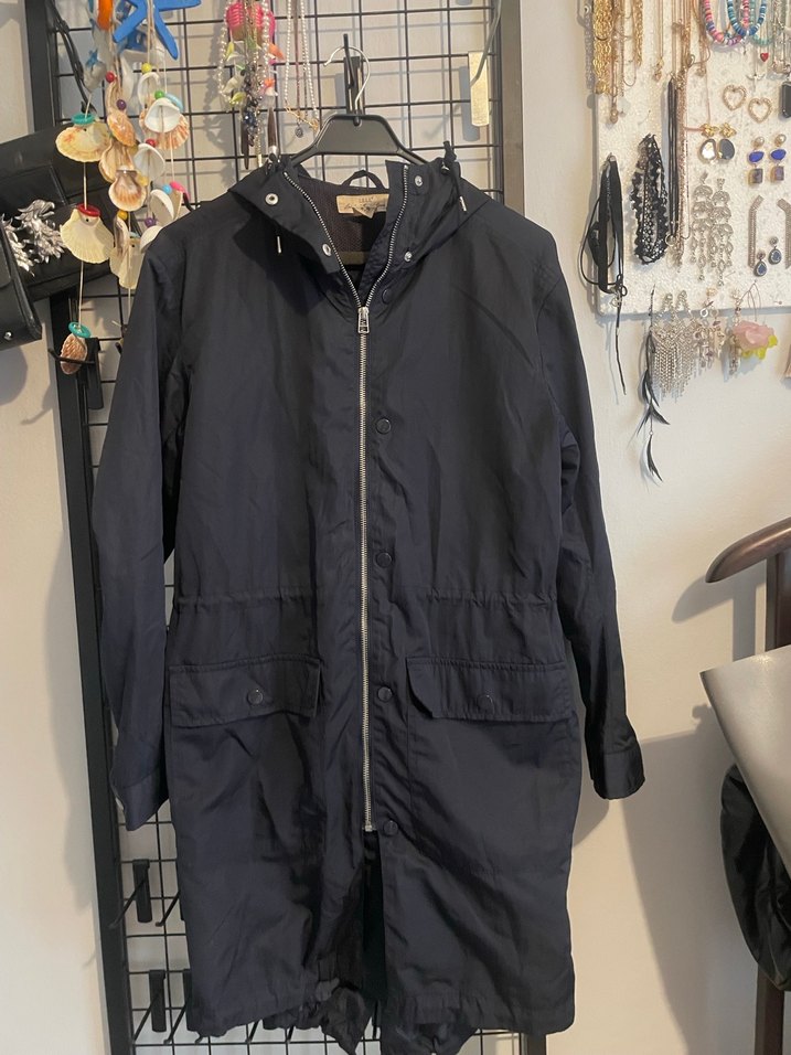 Kadın için rüzgarlık ve yağmurluk. Lacivert renk. Belden içten lastikli