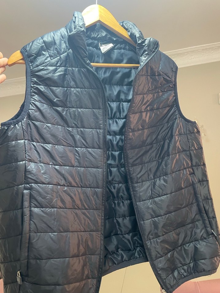 SORUNSUZ ÇOK AZ KULLANILDI Fermuarlı lacivert unisex yelek. Düz, sentetik kumaştan, kolu olmayan ve normal midi boyda, rahat günlük sokak stili için uygundur.
