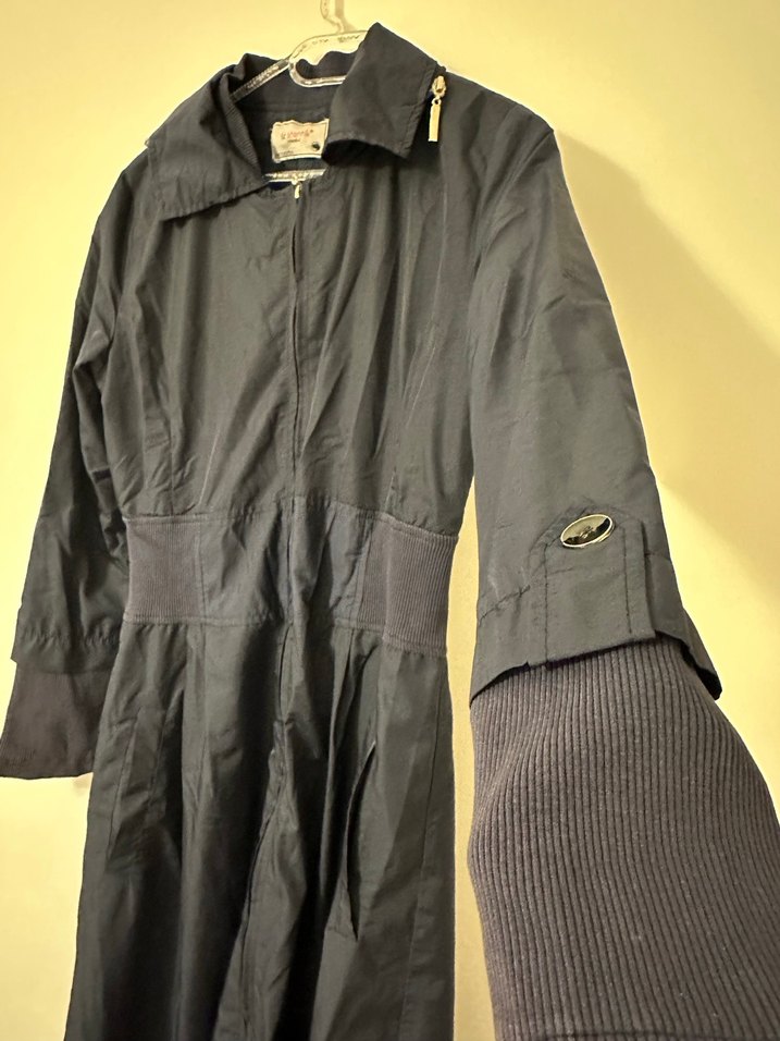 Fermuarlı, yüksek yakalı ve uzun kollu, lacivert renkte, sentetik kumaştan yapılmış, günlük sokak stiline uygun yağmurluk. Kumaş kısmında hafif renk solması var bunu dışında kusur yok şapkasızdır aldığımda öyle satılıyordu…