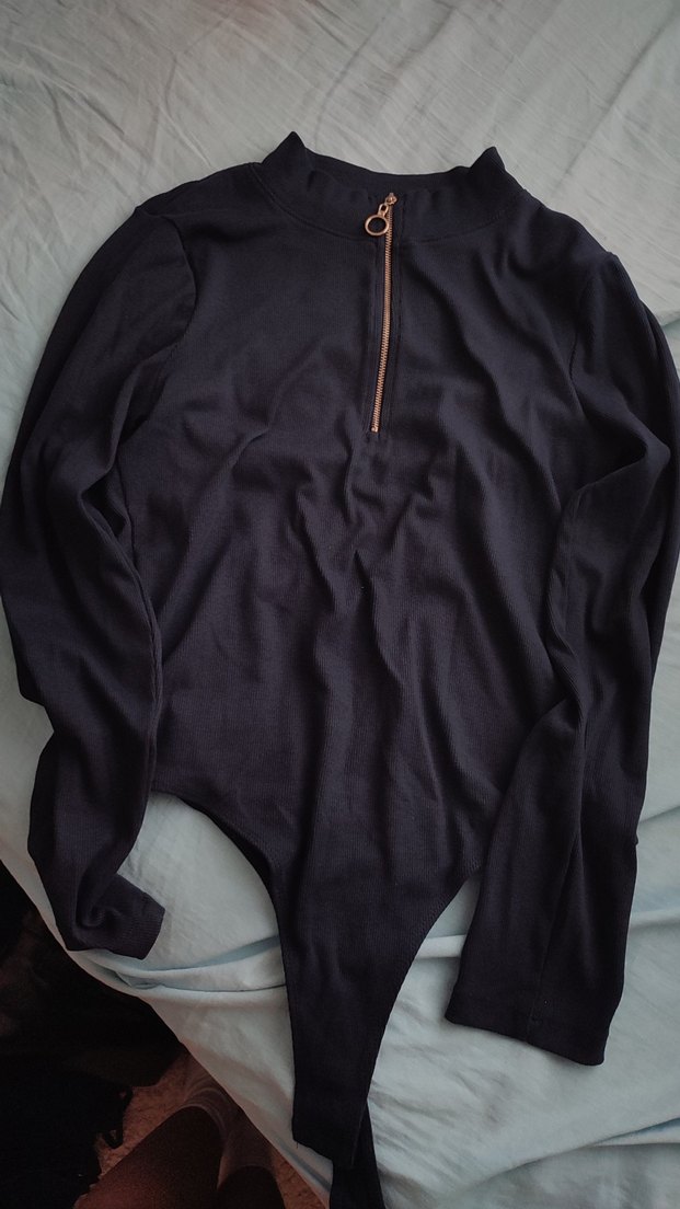 lacivert, fermuarlı ve yüksek yakalı çıtçıtlı kadın bluz, uzun kollu ve vücuda oturan kesime sahiptir. Yumuşak ve sıcak kumaştan yapılmıştır, günlük kullanıma uygundur. bir kaç kere giyildi