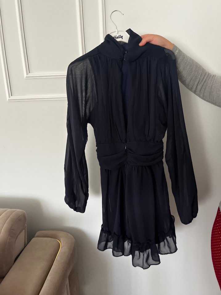 Lacivert uzun kollu sırtında hafif bir dekolte var kısa elbise