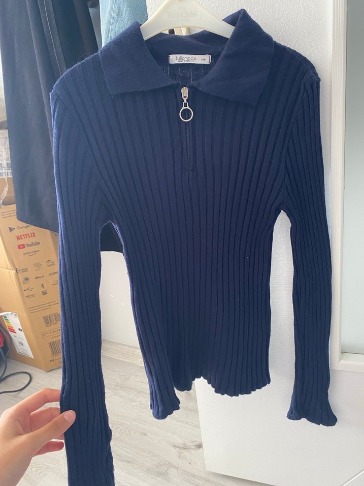 Lacivert renkli, fitilli örgüden yapılmış, uzun kollu,fermuarlı kadın kazak. standart beden birkaç kez giyildi hiç sıkıntısı yok.