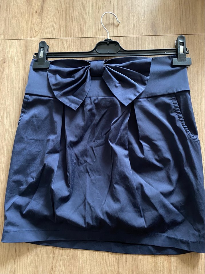 Lacivert mini etek, belinde büyük fiyonk ve pile detaylarıyla, sentetik yumuşak kumaştan, ofis ve sokak şıklığı için uygun.