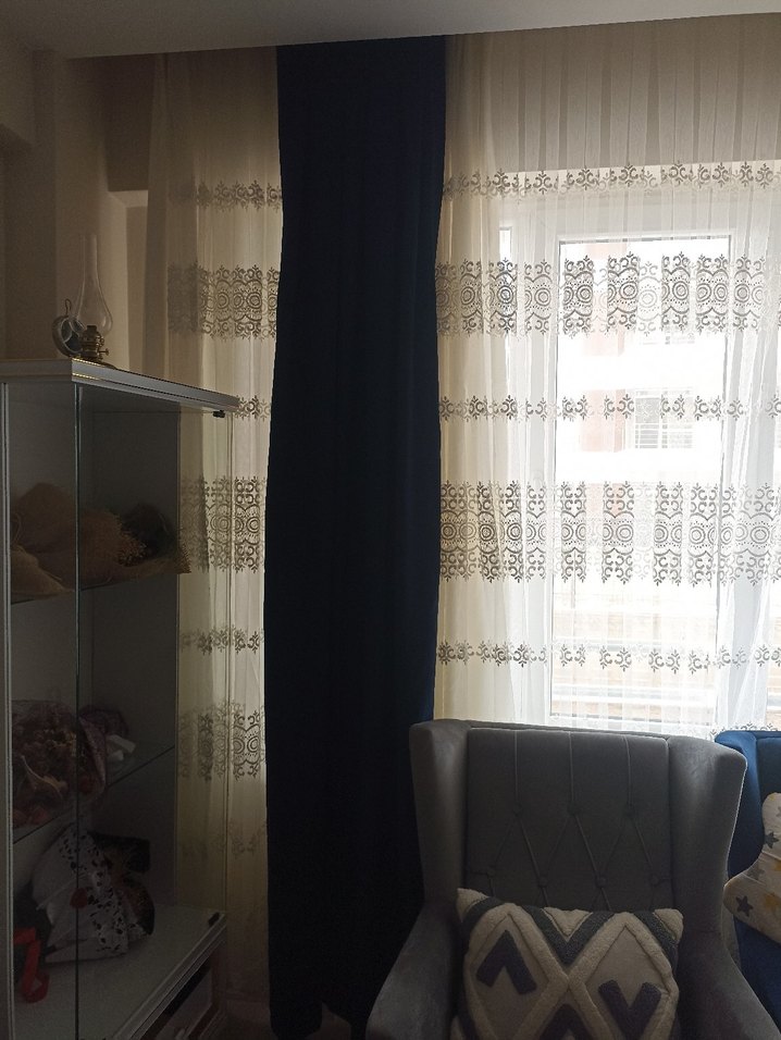Dekoratif 2 adet lacivert fon perde birebir koltuk kumaşından yaptırıldı. kendi kumaşından iki adet bağlama kuşağı da vardır . Bir tanesinin ölçüleri ; uzunluk 260 cm genişlik 45 cm. Pahalı bir kumaştır