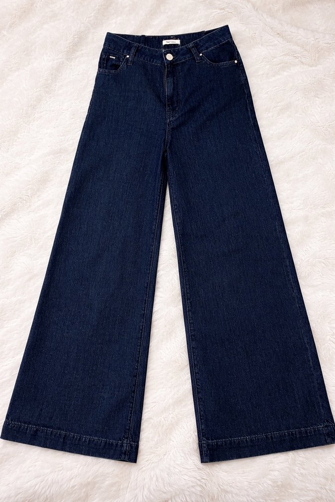 Lacivert renkte, geniş paça kadın denim pantolon. Minimalist ve zahmetsiz şıklık sunar, günlük kullanıma uygundur. Desensiz ve rahat kesimlidir. Bir iki defa giyildi.