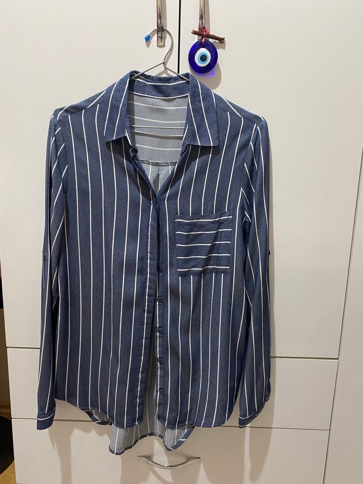 Lacivert üzerü beyaz çizgili uzun kollu kadın gömlek. Az giyildi. Butik ürünü.