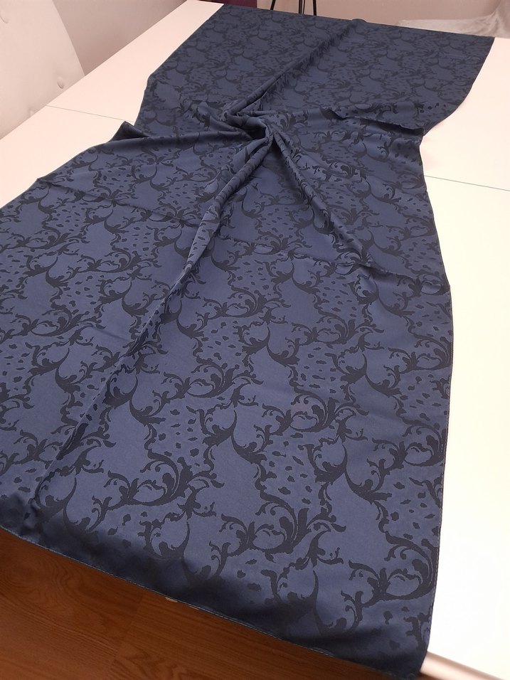 Lacivert renkte, yumuşak sentetik kumaştan, koyu gotik desenli, drapeli kadın şal. Moda ve avangart tarzlar için uygundur.