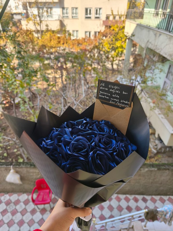 Siyah kağıda sarılı, koyu lacivert güllerden oluşan buket. El yazısıyla küçük bir not kartı eşlik ediyor.