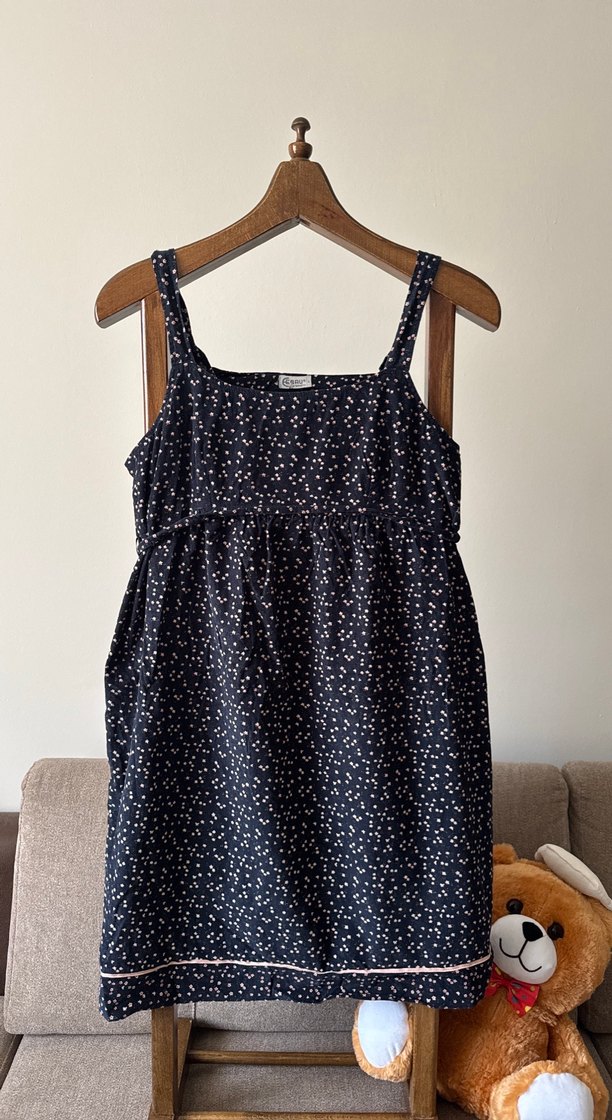 Lacivert renkte, askılı, midi boy, bol kesim hamile ve emzirme geceliği. Küçük puantiyeli deseniyle rahat bir kullanım sunar.