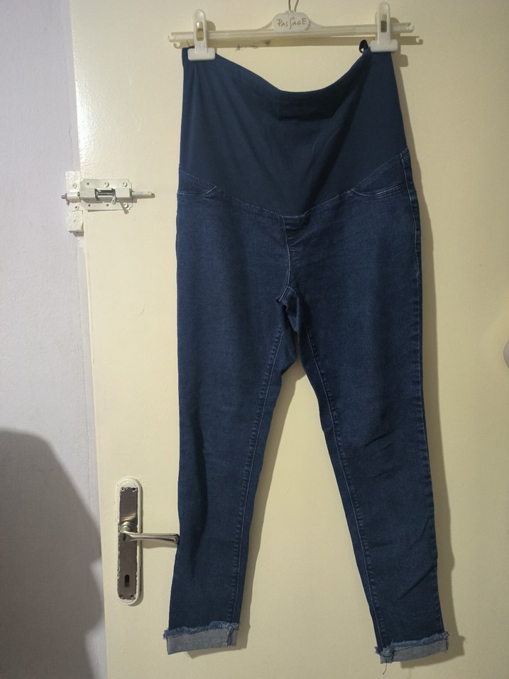Lacivert kot kumaştan, bol kesim ve normal boyda hamile pantolonu. Kemer detaylı, günlük rahat kullanıma uygun.