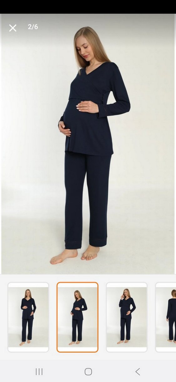Lacivert renkte, uzun kollu, hamile ve emzirme pijama takımı. Rahat kesimli ve düz dokuma kumaştan üretilmiştir.