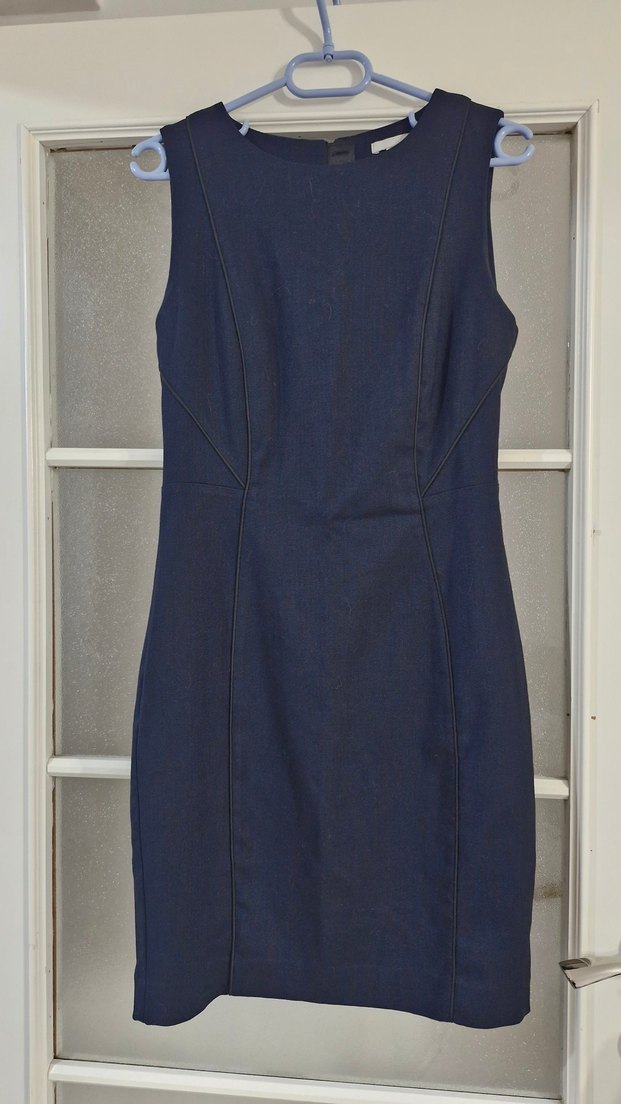Lacivert, kolsuz, bisiklet yakalı elbise, ofis ortamı için uygun, dizüstü boyda ve sade tasarımlıdır.