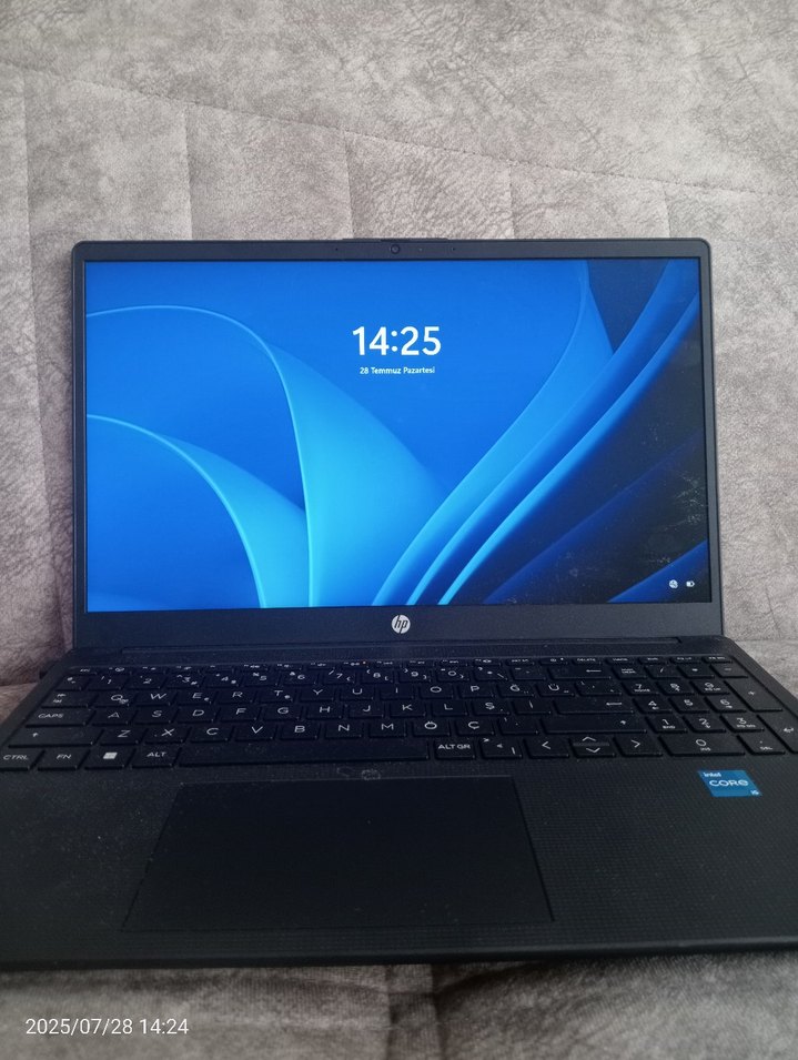 Lacivert HP dizüstü bilgisayar, tam klavye ve net ekran sunar. Görüntüde 2025/07/28 14:24 ve 14:25 tarih damgası yer alır.