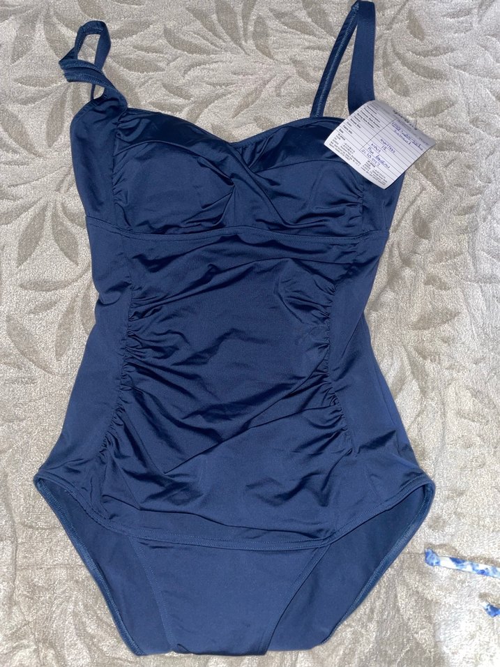 Lacivert, ince askılı, vücuda oturan, midi uzunlukta kadın mayo. Rahat ve şık, plaj için uygun bir spor tarzı. ️