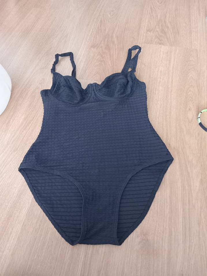 Lacivert renk, ince askılı ve oturan kesime sahip bu mayo, yapılandırılmış göğüs kısmı ve dokulu kumaşıyla günlük kullanıma uygun şık bir görünüme sahiptir.