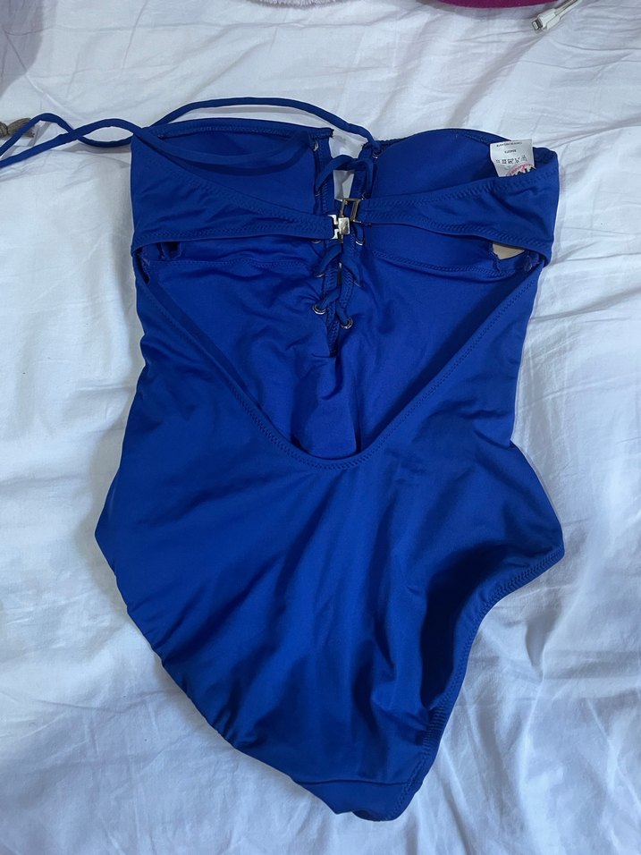 , ince askıları ve normal midi boyu ile lacivert, vücuda oturan bir mayo. plaj tarzı için uygundur. S beden koton sorunsuz bir kere giyildi
