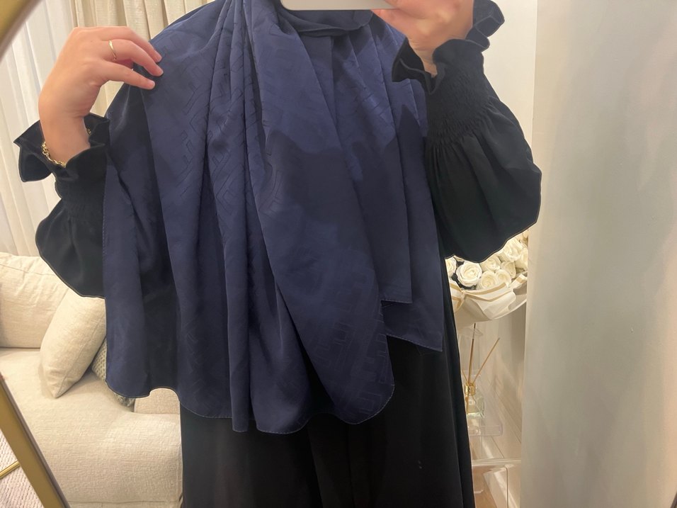 Lacivert renkte, ipek , jakar dokulu ve drapeli tasarıma sahip kadın şalı, mütevazı ve bohem Paris tarzını yansıtıyor. Koyu renk şıklık katıyor.